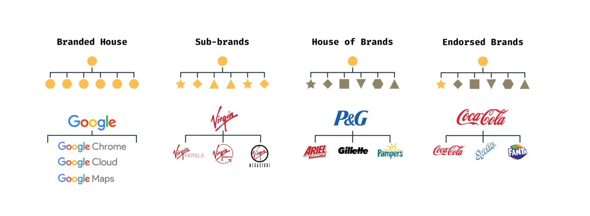 Kaikki tuotteet ja palvelut ovat niputettuna yhden brändin tai etuliitteen alle. Esimerkiksi Googlen tuoteperheeseen kuuluu Google Chrome, Google Maps ja Google Drive. Taustayhtiöt saattavat olla juridisesti omia liiketoimintojaan tai pelkästään brändättyjä liiketoimintayksiköitä. Yksiköiden nimessä on tyypillisesti konsernin etuliite: Eezy Oyj > Eezy Flow, Eezy Valmennuskeskus jne.